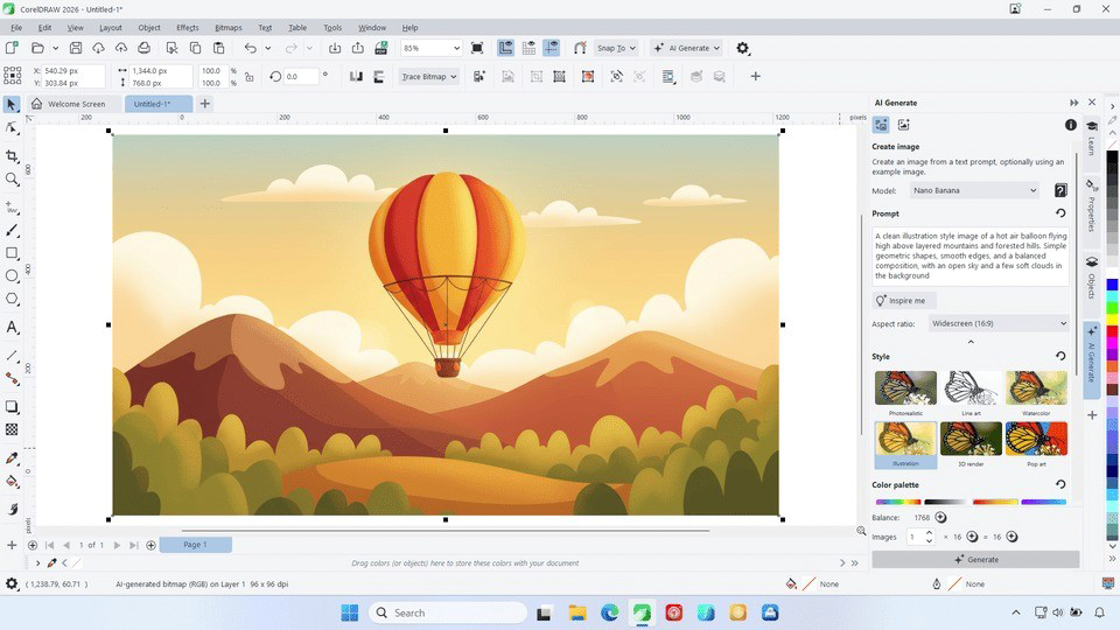 Entre os principais destaques da nova versão está o recurso AI Generate, disponível no CorelDRAW e no Corel PHOTO-PAINT. A ferramenta permite criar imagens a partir de prompts de texto ou conteúdos já existentes, oferecendo múltiplas variações, proporções e estilos visuais.